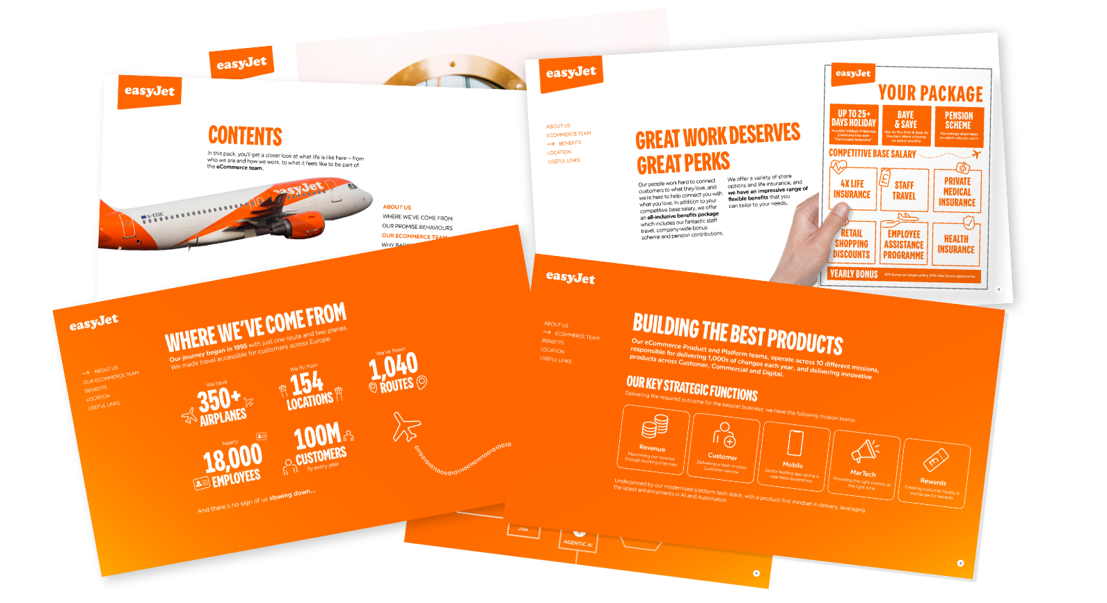 Designed a candidate pack for new easyJet employees using their brand guidelines. Featuring clear infographics and an benefits package to support onboarding.